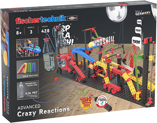 Jetzt gibt’s Action! Mit dem Baukasten Crazy Reactions lassen sich gleich drei aufwendige, sehr unterschiedliche Kettenreaktionen mit spannenden Überraschungseffekten bauen. So werden beispielweise die Funktionen von Seilzug, Hebel und Getriebe oder Druckluft spielerisch erlebbar. Der Baukasten bietet insbesondere kreativen Köpfen viel Raum für Ideen, wobei selbst die drei vorgeschlagenen Basiskonstruktionen schon echte Herausforderungen für Techniktüftler sind. Crazy Reactions ist nach Lust und Laune erweiterbar u. das weit über die beiliegenden gut 400 Teile dieser Packung hinaus. Alle mögliche Alltagsgegenstände können z.B. integriert werden, u. auch die weiteren Kettenreaktion-Baukästen von fischertechnik Funny Machines & Funny Reactions sind hiermit kombinierbar. Eine tolle „Wundertüte“ für kreative Technikfans.